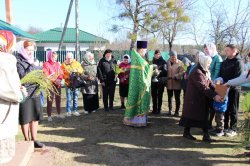 Во время праздничного богослужения по традиции были освящены принесенные в храм вербы и цветы.